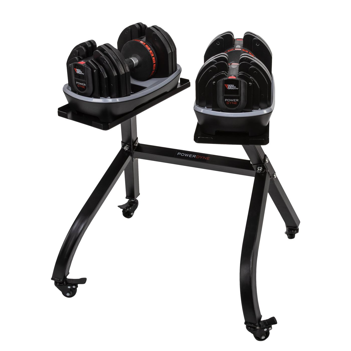 Strength training just got easier with the PowerDyne 55LBS Adjustable Dumbbell Set (2) by NonZero Gravity. Equipment included: 2 dumbbells, 20 adjustable iron weight plates, and 2 secure storage trays with lifting handles. The weights are designed to be both functional and compact measuring 9.25x15.5x3.75-inches each. Featuring easy to adjust weight plates and no-slip grip handles. Weight increments from: 5, 7, 9, 11, 13, 15, 18, 20, 22, 24, 26, 28, 33, 37, 42, 46, 51 to 55 lbs.T he sturdy base is made with heavy-duty steel and four (4) swivel caster wheels made of nylon. Store and transport two (2) PowerDyne Dumbbells at a time. Place the stand on a smooth surface and lock it in place with the wheel lock safety feature before use.