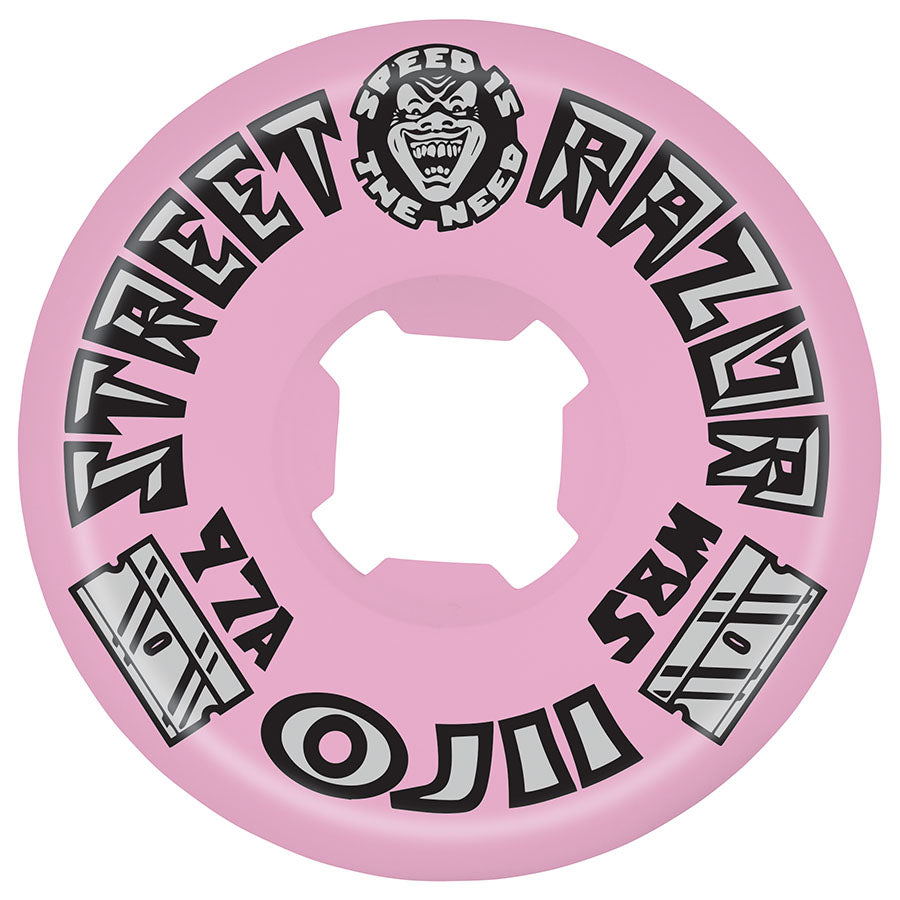The pink OJ Street Razors come in a broad 58mm diameter for insane speed. The 97A hardness gives grip in all the right places without sacrificing those powerslides.